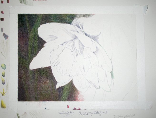An updated shot of my WIP. I worked on the background some more, pulling in more definition of the grass. Don’t ask me why I didn’t crop the photo closer, but at least you can see my artist tape around the edges to keep it clean. (I added a few colored pencil names at the bottom and top so I wouldn’t forget which ones I used where…)