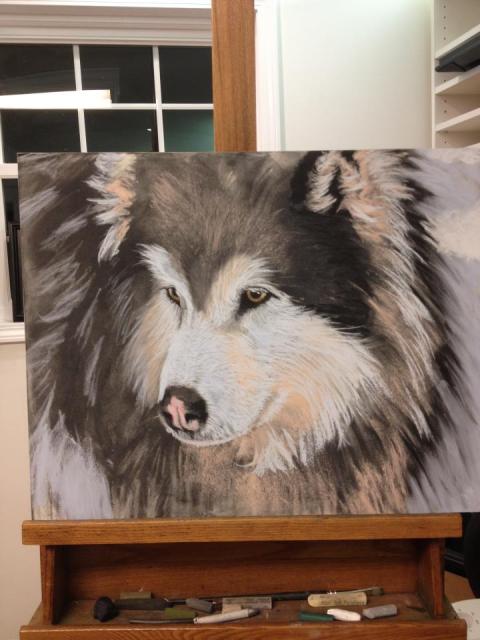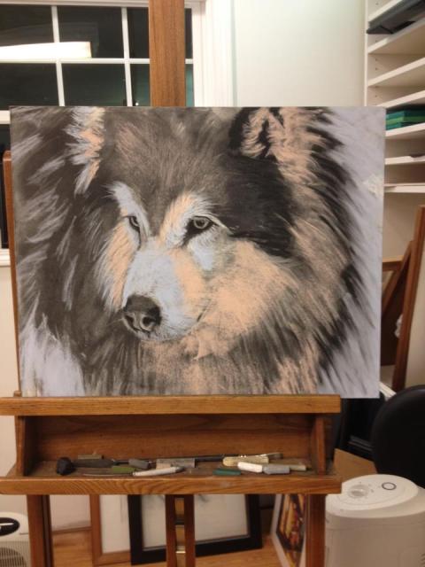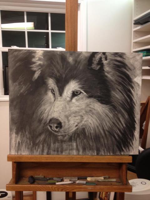 Now I’m adding more detail now that I’m satisfied with the placement, but still using just charcoal and eraser. (There might be a little bit of pastel on the right ear).