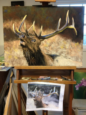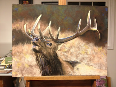 This is the WIP for the Elk. In order to depict the massive rack, I wanted to do this on the largest surface I had in the studio. So, I used my only 18″ x 24″ pastelbord (gray). If I had something larger, I would have used it. I’ve found I like to work large when working on animals…maybe it’s because I prefer to stand when using charcoal and pastel, maybe it’s because the nature of the subject warrants to me really get in the fur without getting bogged down with the detail.