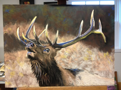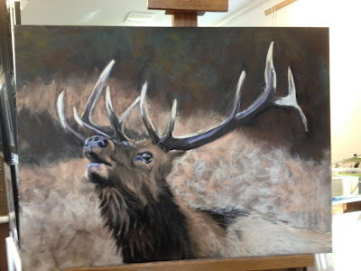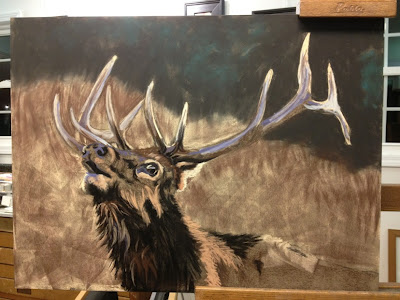 So let’s get back to the elk…I’ve added captions to each step. I guess I didn’t take a picture of the drawing, but my favorite step is below…right after I’ve drawn in the subject, and I pick up the first and second color. It’s just magic. 🙂